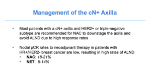 Varios estudios prospectivos randomizados que ya todos conocemos, que mostraron una alta tasa de identificación del ganglio centinela, con una baja tasa de falsos negativos (FN), por debajo del 10% cuando se obtienen 3 o más ganglios (+) y cuando se usa el doble método y el clipado del ganglio biopsiado. Hay una baja tasa de recidivas regionales en las pacientes que negativizaron la axila durante la neoadyuvancia, aproximadamente del 1-1,6% con un seguimiento ya prolongado, que la tasa de respuesta completa ganglionar varía de acuerdo al subtipo como ya sabemos en el caso de RE (+) HER2 (-) de un 18%, En los HER2 (-) puros de un 60% y en triple negativo (TN) un 48% y el porcentaje de ganglios centinelas no positivos cuando tenemos ganglios centinelas positivos postneoadyuvancia varía entre un 60-70%, si es distinto si son células tumorales aisladas (ITC’s) pero si tenemos micro o macrometastasis. el porcentaje de ganglios no centinelas positivos está por arriba del 60%, estudios prospectivos como el Alliance y el TAXIS evaluaron la posibilidad de hacer en estas pacientes RT+VAX vs. RT sola, tendremos posteriormente los resultados de estos estudios.