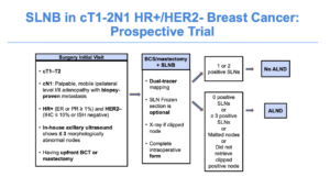 Conclusión: hasta dos ganglios patológicos en la eco axilar aún sabiendo que la axila es oncológica (sea palpable la misma o no) permite no hacer linfadenectomia y se puede manejar como un Z0011. Algo que hasta acá nunca hicimos. El otro trabajo de la misma Institución es uno que randomiza a pacientes T1-T2 RE (+) HER2 (-), las pacientes son axila positivas, palpables, con ganglios móviles de niveles I o II, biopsia confirmatoria, se hace una ecografia axilar en el centro (Memorial, a eso le llaman in house) y si hay hasta 3 ganglios patológicos ya sea que la paciente vaya a una cirugía conservadora o una mastectomía se hace biopsia de ganglio centinela con doble método (similar a un escenario postneoadyuvancia) la congelación es opcional, si el ganglio fue clipado se hace comprobación radiológica de que el mismo fue extirpado. Y, finalmente si solo hay hasta 2 ganglios patológicos: no se realiza la linfadenectomia, y su hay 3 o más o un conglomerado adenopático o no se logra extraer el ganglio marcado previamente al momento de la biopsia (clipado para ellos, para nosotros sería con carbón) se lleva a cabo la linfadenectomia.