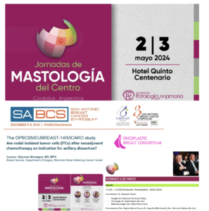 En la Ciudad de Córdoba, en mayo del 2024 la Sociedad de Patología Mamaria provincial llevó a cabo las Jornadas de Mastología del Centro. El viernes 3 de mayo el presidente de la Sociedad Argentina de Mastologia, Dr. Francisco Terrier fue invitado a disertar sobre las novedades del 2023-2024 quirúrgicas. El Presentó el trabajo de Giacomo Montagna, el Eubreast 14R-ICARO que plantea el tópico sobre si las células tumorales aisladas (ITCS´s) son en el escenario de la postneoadyuvancia indicación de linfadenectomía axilar.