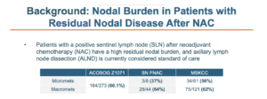 El fondo del problema: nosotros sabemos que en la postneoadyuvancia la persistencia de compromiso ganglionar en el ganglio centinela se asocia a alta carga tumoral ganglionar siendo mayor al 50% el compromiso de más ganglios no centinelas tanto en presencia de micro como de macrometástasis. Por lo tanto el vaciamiento axilar es estándar.