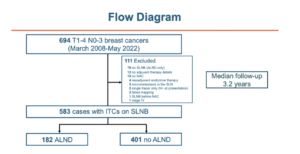 En el diagrama de flujo del estudio, 694 pacientes fueron randomizadas, aunque se excluyeron 111 y se analizan 583 pacientes con ITC´s en la BGC de las cuales 182 fueron randomizadas a realizar linfadenectomia axilar, mientras que 401 no completaron la cirugía. El vaciamiento o no axilar estaba a criterio del cirujano. Seguimiento medio 3.2 años. El factor más asociado a probablilidad de realizar la linfadenectomia axilar (VAX) fue lógicamente la mayor carga de enfermedad axilar. Es decir, las pacientes N2 y N3 al inicio. Aproximadamente 80% recibió esquemas basados en antracilicas y taxanos y un 77% recibió RT axilar (82% en brazo de VAX y 75% en brazo de no VAX. No encontraron diferencias con el paso del tiempo más allá de los cambios en la repuestas a la neoadyuvancia: aproximadamente 30% siempre va a vaciamiento axilar. Casi 70% eran tumores luminales dentro de los cuales el 30% eran luminales HER positivos, el factor más asociado a VAX es la presencia de ILV en el tumor.