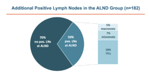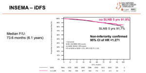 Otro planteo que uno puedo realizar es el siguiente: ahora tenemos la posibilidad de usar ICDK’s 4/6 en el escenario de la adyuvancia, en pacientes que son axila positivas, si una paciente omite la BGC y si esa paciente tenia una axila positiva no nos estamos privando de tratar adecuadamente a esa paciente con ribociclib o abemaciclib adyuvante? Cuando una ve la publicación del New England Jornal of Medicine aproximadamente un 14% de pacientes que han realizado la BGC de hecho si tenían una axila positiva, ecograficamente de un 10-15% de ratio de pacientes que sospechábamos que eran axila negativa resultan ser axila positiva, y esa seria una paciente que yo discutiría si con el uso de ribociclib para tumores pequeños con axila positiva… esto hace que uno cambie un poco como analiza estos datos también. Esto es algo que fue hecho antes de la era de los ICDK’s 4/6.