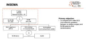 El INSEMA trial es un trabajo prospectivo randomizado que trata este tema, evalúa pacientes T1-T2 N0 con cirugía conservadora y RT a realizar en un ppio. RT vs. observación y a su vez subdivide a los pacientes con centinela positivos de acuerdo al número de ganglios positivos que tienen, el grupo de 1 a 3 centinelas hace una segunda randomización a realizar centinela vs linfadenectomía, abordaremos este trabajo a continuación ya que cambiara nuestra practica habitual y se convertirá en un nuevo estándar.