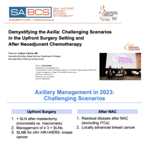 Los días 13 y 14 de abril del 2024 se llevó a cabo el Simposio Muldisciplinario de cáncer de mama post Texas 2023 en la Universidad Católica Argentina, Puerto Madero. Hubo muchas charlas sobre las novedades del Congreso de San Antonio del 2023. No fue el objetivo de la presentación abordar todos los aspectos que el cirujano especialista en cirugía mamaria debe conocer acerca del manejo de la cirugía axilar pero si quizás brindar las novedades del 2024. Por ende, lo más adecuado es brindar una actualización de lo mas nuevo en el manejo quirúrgico de los escenarios que resultan mas desafiantes.